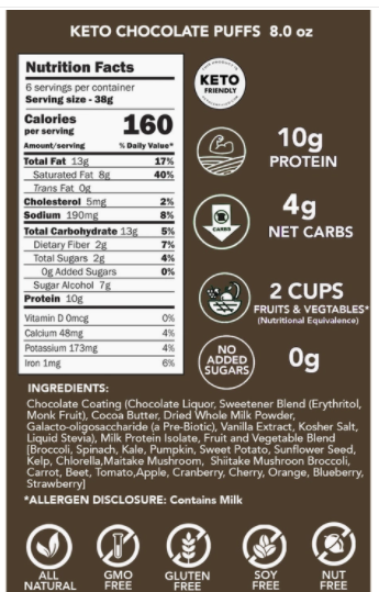 - 10g OF PROTEIN PLUS THE NUTRIENTS OF 2 SERVINGS OF FRUITS AND VEGTABLES, NON-GMO, GLUTEN FREE, SOY FREE, NUT FREE, 98% LACTOSE FREE: A keto diet friendly substitution for salty carb-loaded snacks, Say goodbye to carb cravings with our all natural high protein puffs, that fits the keto snack requirements of low carbs and low sugar, and tastes way better than just puffed cheese, pork rinds or low carb bread.