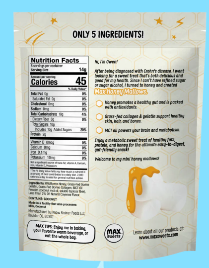 Max Honey Mallows are the perfect guilt-free treat. Sweetened with mineral-rich wildflower honey—nature’s original superfood—they're free from refined sugar and sugar alcohol. Each bite delivers gut-loving goodness, healthy fats, protein, and antioxidants to satisfy your sweet tooth and support your health. Snack happy. Eat the whole bag. We won’t judge.